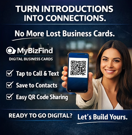 Introducing MyBizFind Digital Business Cards — a modern, mobile-first way to share your business instantly.