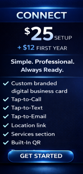 MyBizFind Digital Business Cards are modern, interactive contact hubs designed to replace traditional paper cards with a dynamic, mobile-friendly experience. Built for ease of use and maximum engagement, each card lets people tap to call, text, email, get directions, save contact info, share instantly, and scan a QR code — all from one clean, professional interface.